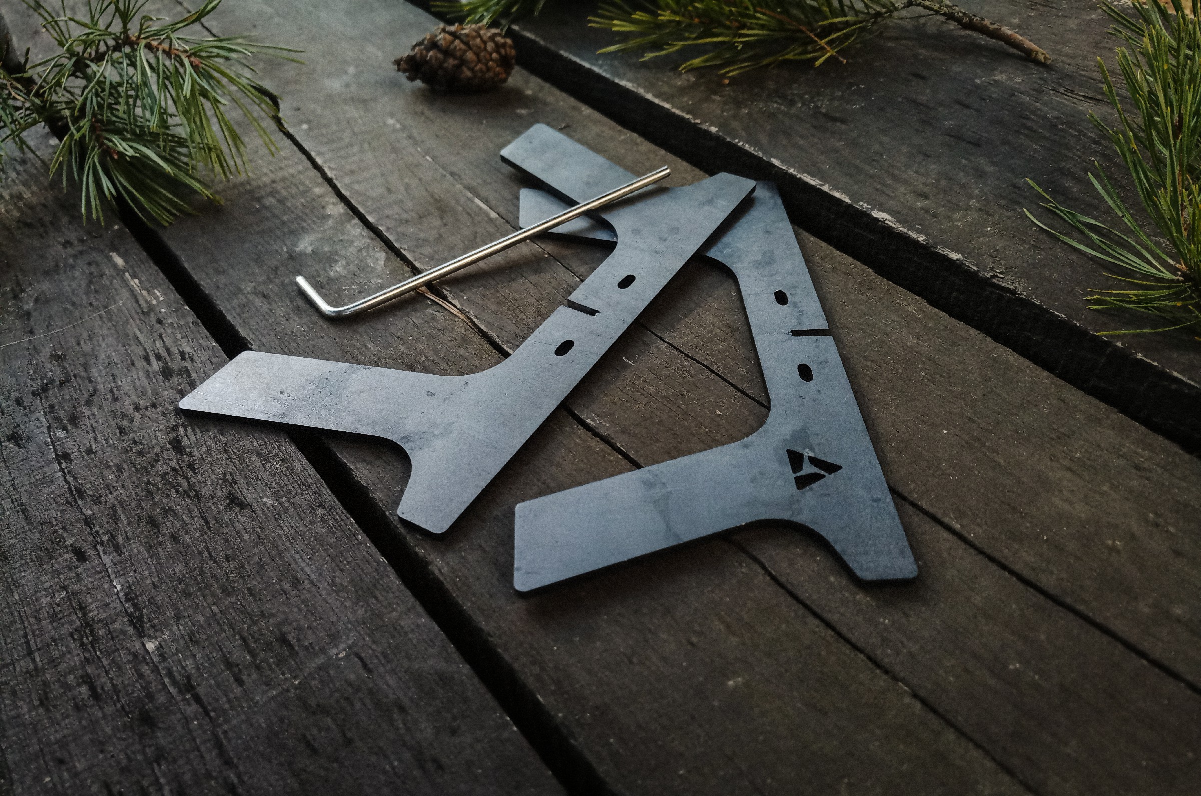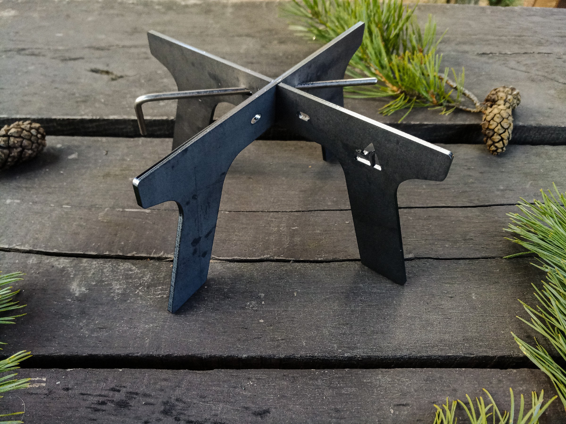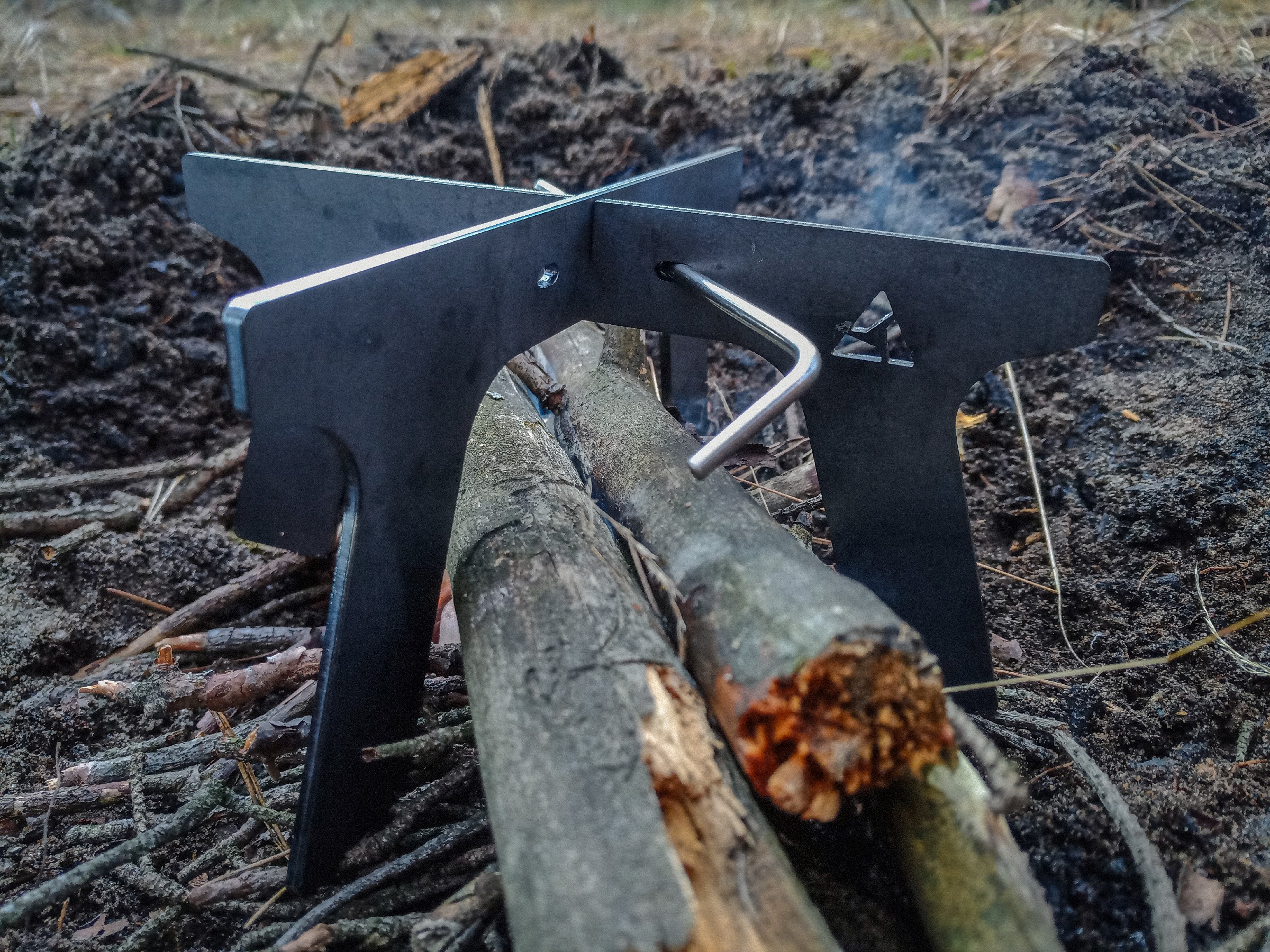Konstrukcja paleniska jest niezwykle prosta, a co za tym idzie wyjątkowo niezawodna. Dwa elementy statywu i spinający je trzpień sprawiają, że rozłożenie zajmuje dosłownie kilka sekund. Dzięki zastosowaniu stali węglowej, podstawa jest możliwa do łatwej konserwacji, podobnie jak ma to miejsce w przypadku wykonanych z tego materiału patelni. Grubość elementów sprawia natomiast, że palenisko jest niezwykle odporne na odkształcenia pod wpływem temperatury, oraz potrafi z łatwością utrzymać naczynia z zawartością o wadze dochodzącej do 50 kg. Dzięki temu nie jesteśmy ograniczeni jedynie do usmażenia burgera na lekkiej patelni – nic nie stoi na przeszkodzie ugotowania solidnego garnka zupy czy gulaszu, który nasyci żołądki kilkunastoosobowej drużyny.