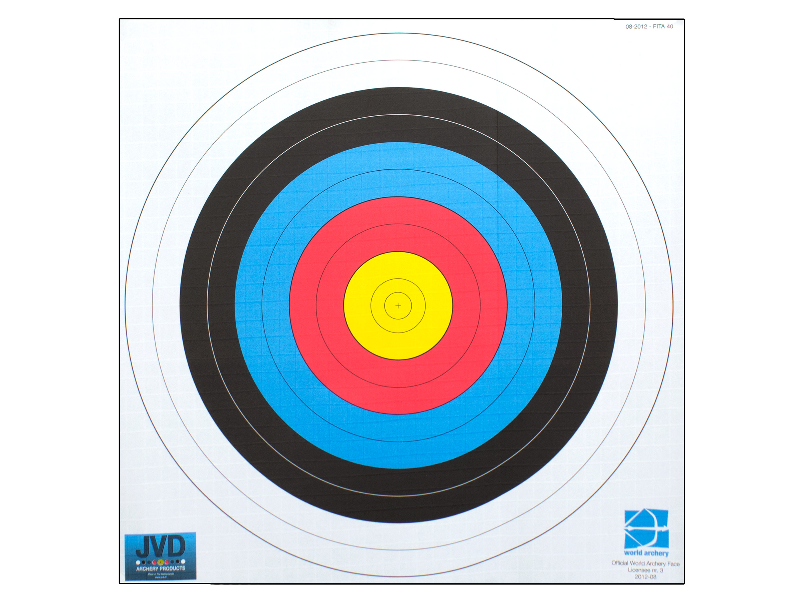 Tarcza łucznicza JVD FITA WA o średnicy 122 cm (zewnętrzny pierścień), posiadająca atest Światowej Federacji Łuczniczej (WA - World Archery, dawniej FITA).