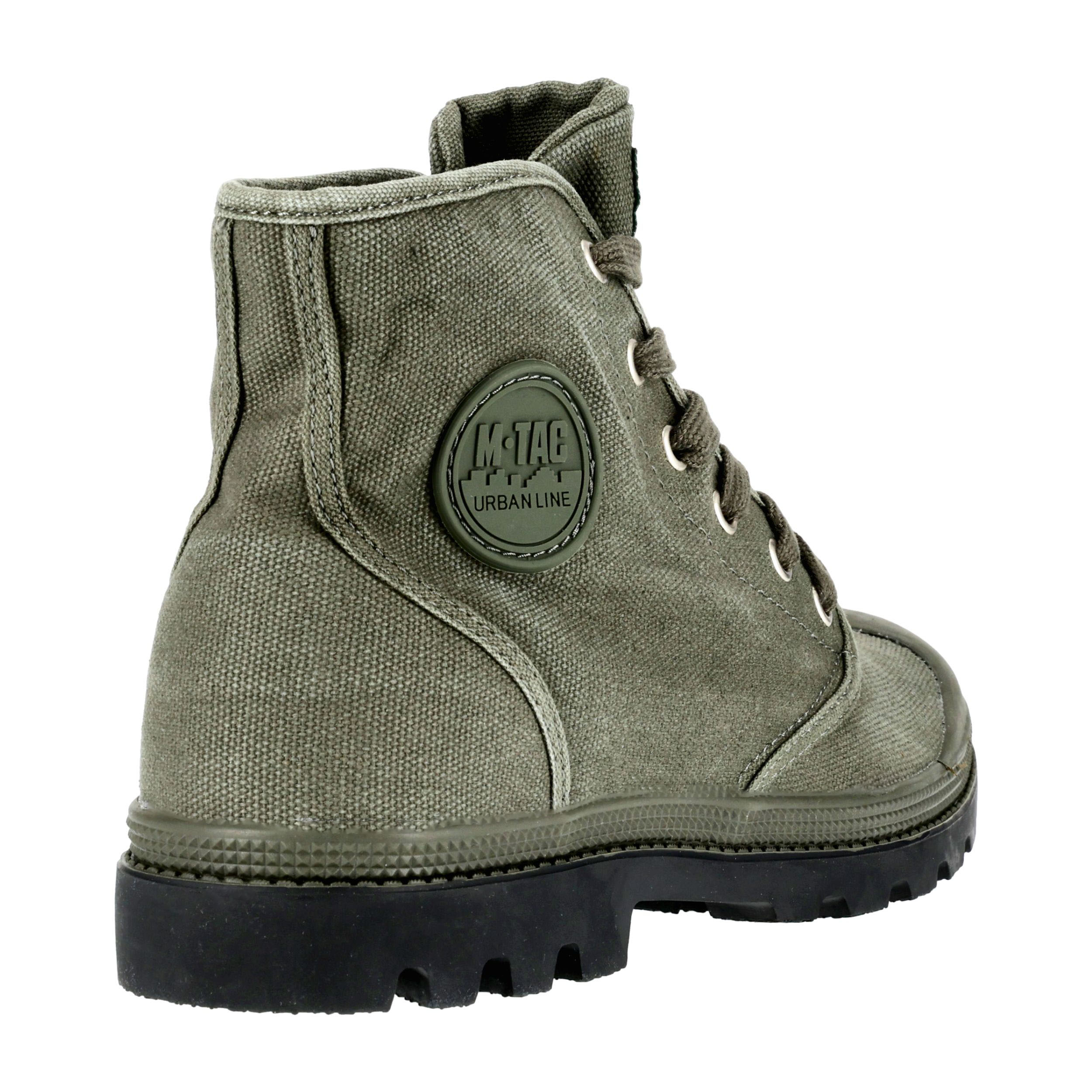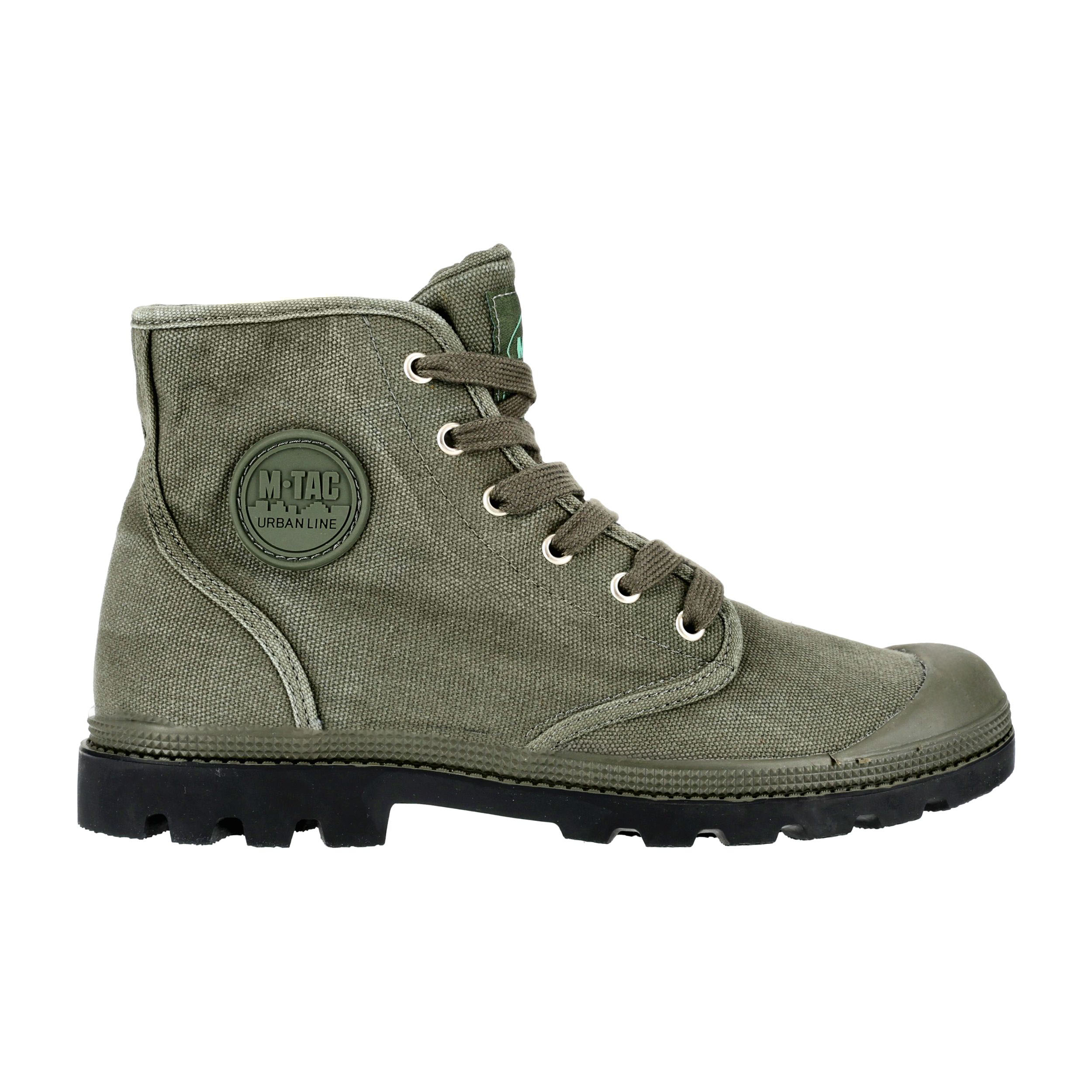 Cholewki butów wykonano z mocnego płótna bawełnianego, które gwarantuje trwałość, dobrą wentylację, oraz krótki czas schnięcia po przemoczeniu. Buta wiązane są za pomocą szerokich płaskich sznurowadeł, przewlekanych przez duże otwory z okuciami. To proste rozwiązania gwarantuje trwałość mocowania oraz szybkość wiązania. Wysoka cholewka dobrze stabilizuje kostkę podczas marszu i chroni przed przedostawaniem się kurzu, piachu i insektów. Osoby preferujące wolny styl ubierania się mogą zrezygnować z wysokiego wiązania butów lub luźniej wiązać górną część cholewki. Podobnie jak w butach Legii Cudzoziemskiej trampki M-TAC mają grubą gumową podeszwę z przyczepnym bieżnikiem, masywny nosek chroniący palce przed uderzeniem oraz szeroką lamówkę z gumy łączącą cholewkę i podeszwę. Przed kontuzjami stopy chroni dodatkową warstwą tkaniny naszyta na piętach. Na zewnętrznej ściance butów umieszczono gumowy emblemat „М-ТАС Urban Line”.