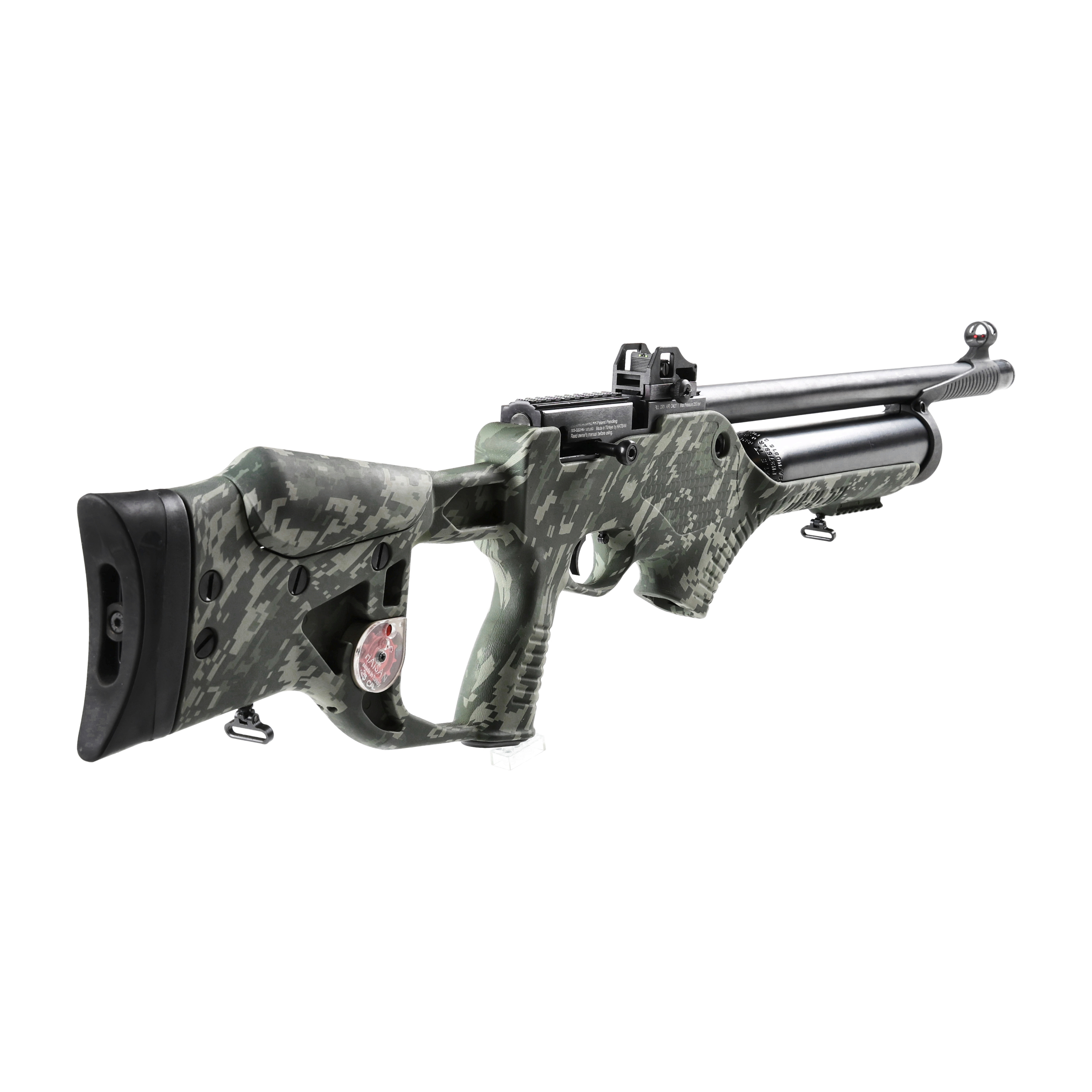 Wiatrówka PCP Optima by Hatsan Barrage M2 6,35 mm to półautomatyczny karabinek PCP w układzie bullpup, z systemem automatycznego przeładowania śrutu, wyposażony w precyzyjną czokowaną lufę oraz drewnianą osadę thumb-hole z regulowaną stopką i baką policzkową. Osada w kamuflażu cyfrowym M2.
