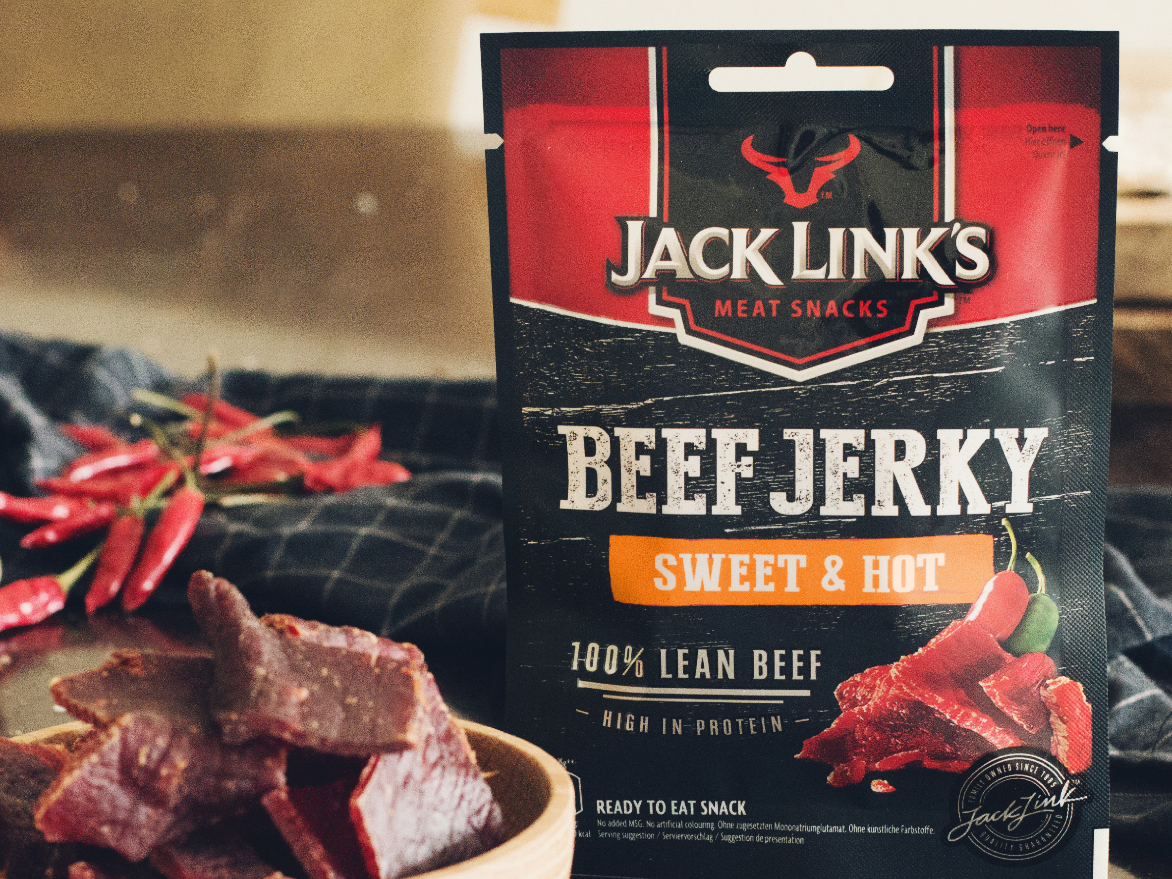 Beef Jerky firmy Jack Link’s to zdrowa przekąska pomiędzy posiłkami, pożywny posiłek dla osób aktywnie spędzających czas na świeży powietrzu, a także smaczna przystawka do ulubionej whisky lub piwa.