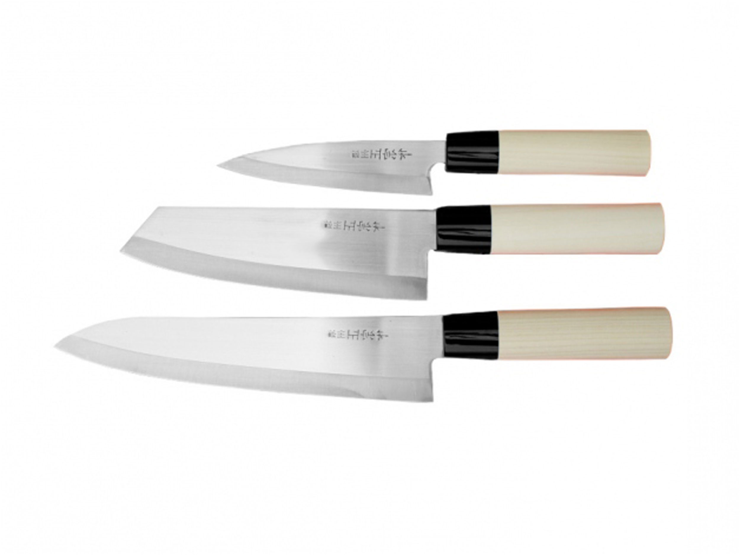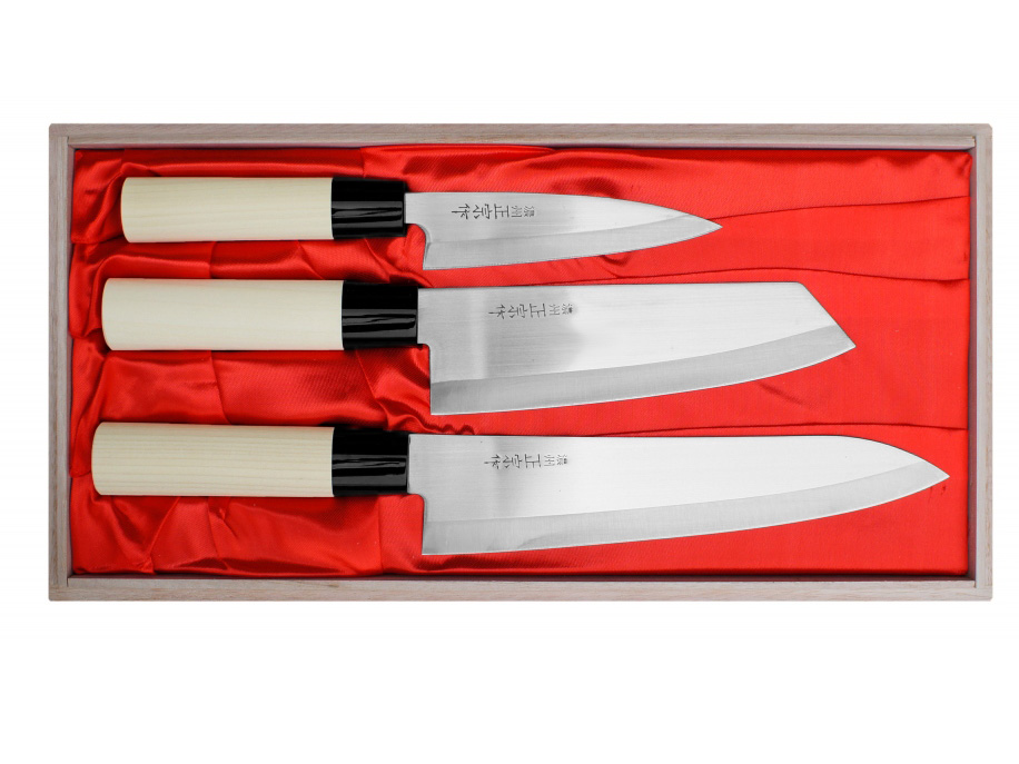Zestaw 3 noży Satake Megumi Szefa kuchni / Santoku Bunka / nóż uniwersalny to komplet japońskich noży kuchennych zapakowanych w eleganckie drewniane pudełko, dzięki czemu stanowią idealny pomysł na prezent dla każdego pasjonata gotowania.