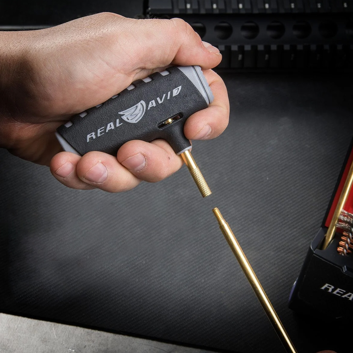 Zestaw do czyszczenia broni Real Avid Gun Boss Pro AR-15 oferuje użytkownikowi:Kompleksowy przegląd narzędzi jaki oferuje zestaw do czyszczenia broni Real Avid Gun Boss Pro pozwoli nam na przeprowadzenie pełnej, skutecznej konserwacji naszego karabinka. Skrobaki umożliwiają nam pozbycie się najtrudniejszych zanieczyszczeń bez ryzyka uszkodzenia powierzchni. Nylonowa szczotka zagwarantuje wydajne oczyszczenie wnętrza broni ze wstępnie usuniętego nagaru, natomiast dedykowane do rygli przecieraki idealnie sprawdzą się przy konserwacji tego uciążliwego obszaru. Dzięki zastosowaniu obrotowej rączki oraz szeregu przedłużek wycior pozwoli na poprawne czyszczenie broni z lufami nawet do 20 cali. Rotacja szczotki zapewnia nam w tym przypadku odpowiednie jej prowadzenie wzdłuż gwintu.