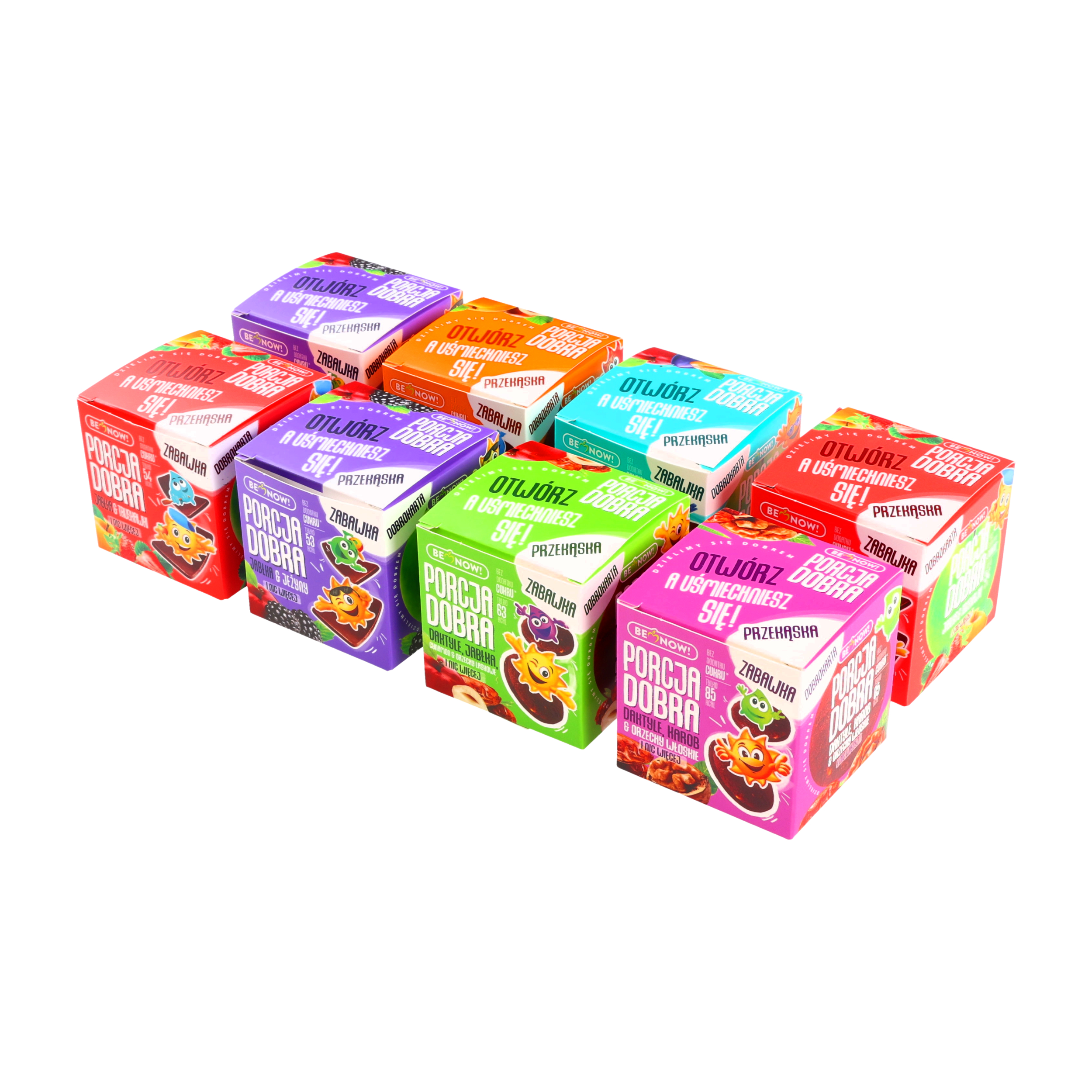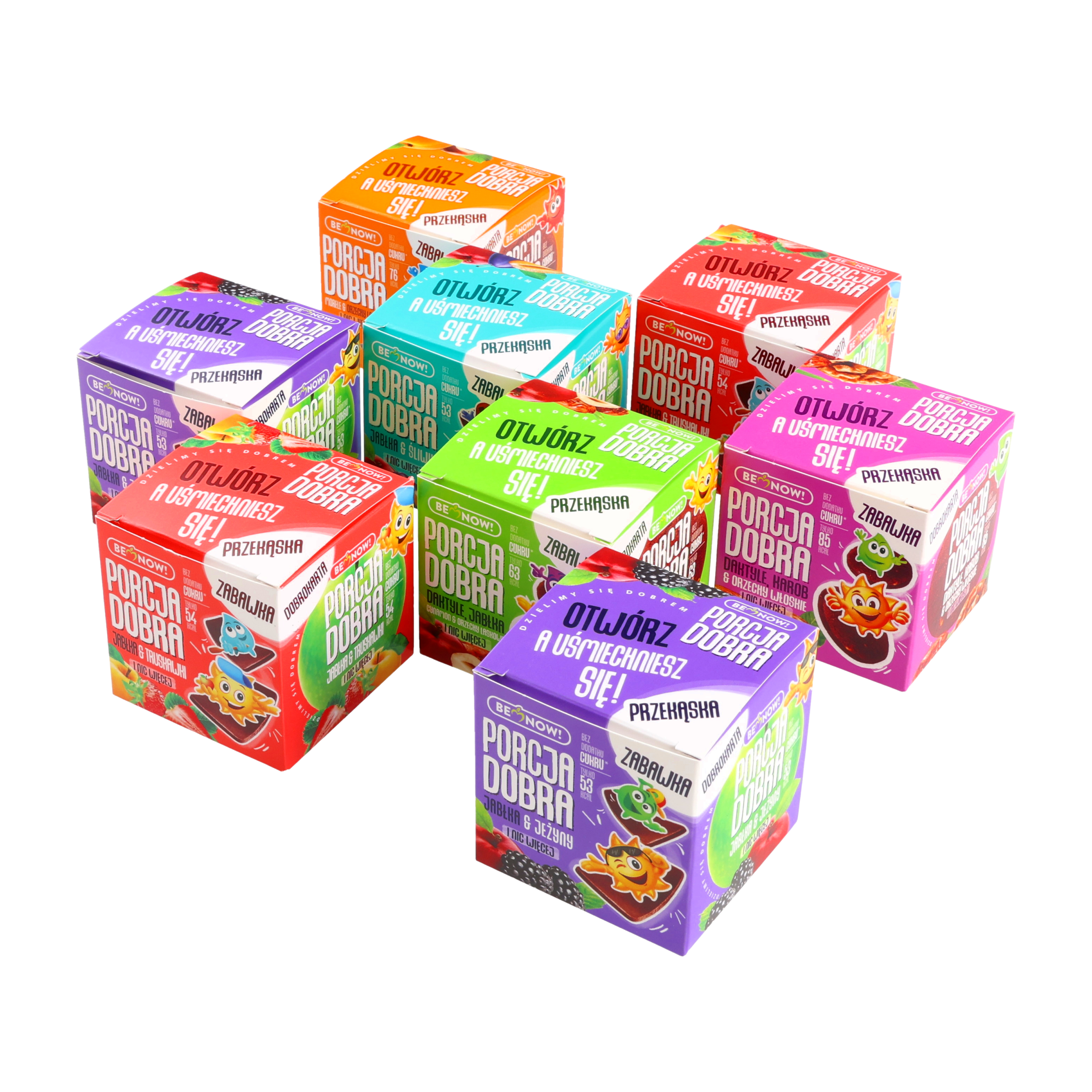Kolorowe, niewielkie pudełeczko to super kostka niespodzianka dla dzieci. Pozytywne, wesołe opakowanie, w środku zdrowa przekąska (listek owocowy lub krążek owocowo - orzechowy), niewielkie opakowanie klocków typu lego oraz kolorowa karta (jedna z kilku, które również można kolekcjonować).