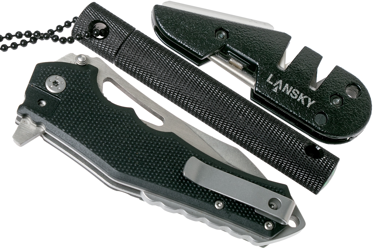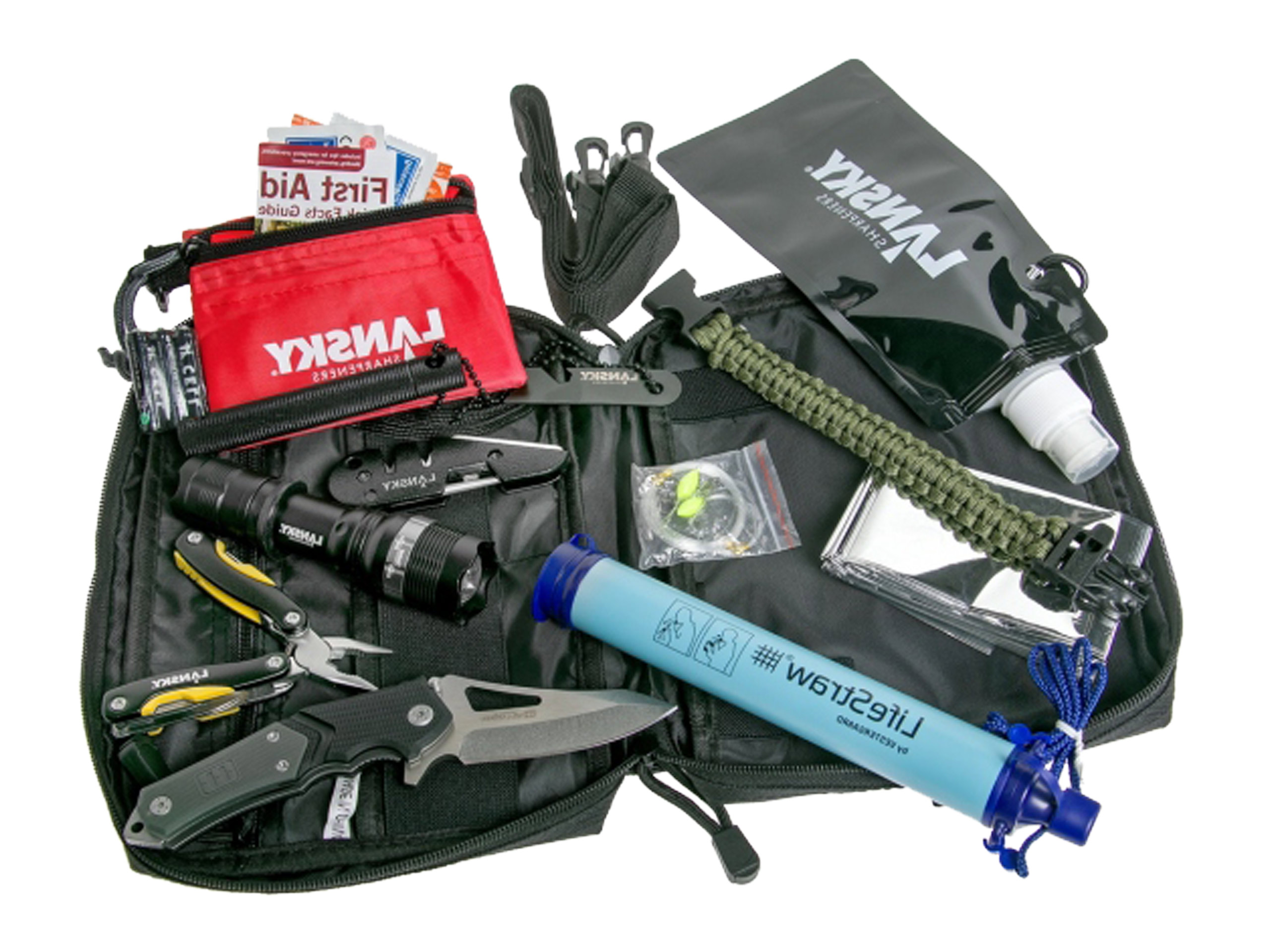 Elementy wyposażenia zestawu przetrwania: krzesiwo z kompasem i draską, zwijana butelka na wodę, apteczka osobista, zestaw do łowienia ryb (haczyki, ciężarki, żyłka), wielofunkcyjny multiotool Lansky, koc ratunkowy (folia termiczna), nóż składany Lansky Responder, uniwersalna ostrzałka Lansky Bla