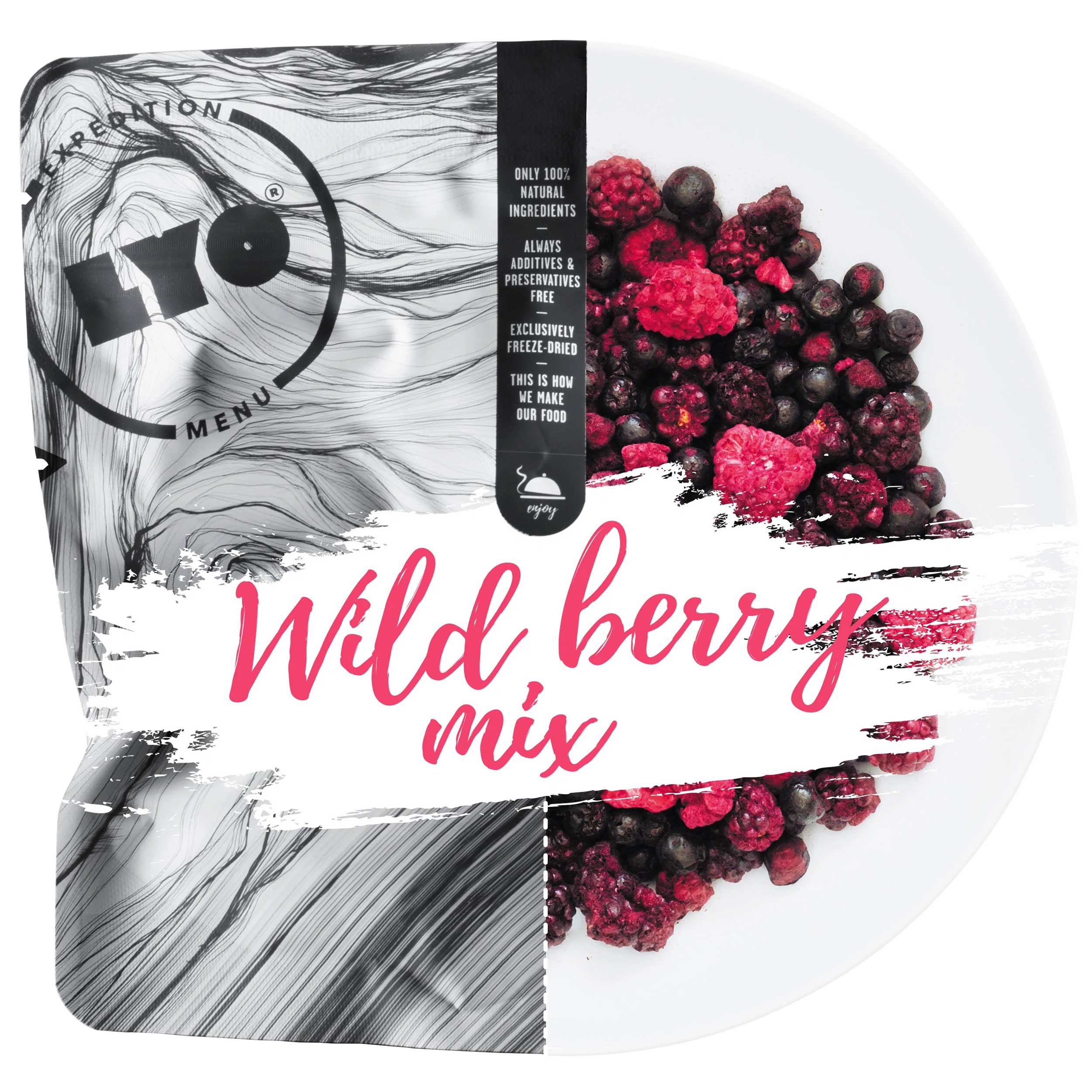 Mało która słodka przekąska jest tak zdrowa i pokrzepiająca jak owoce. Liofilizowane owoce Lyofood zawierają wszystkie zalety tych pożywnych przekąsek, jednocześnie będąc dużo lżejszymi i łatwiejszymi w przechowywaniu. Czy to podczas długotrwałego trekkingu, czy całodziennego polowania dostarczą nam szybki zastrzyk energii. Dzięki niemal całkowitemu usunięciu wody nie musimy obawiać się pleśnienia jak i zabezpieczać przed nimi bagażu. Wersja zawierająca mieszankę malin, jeżyn oraz jagód.